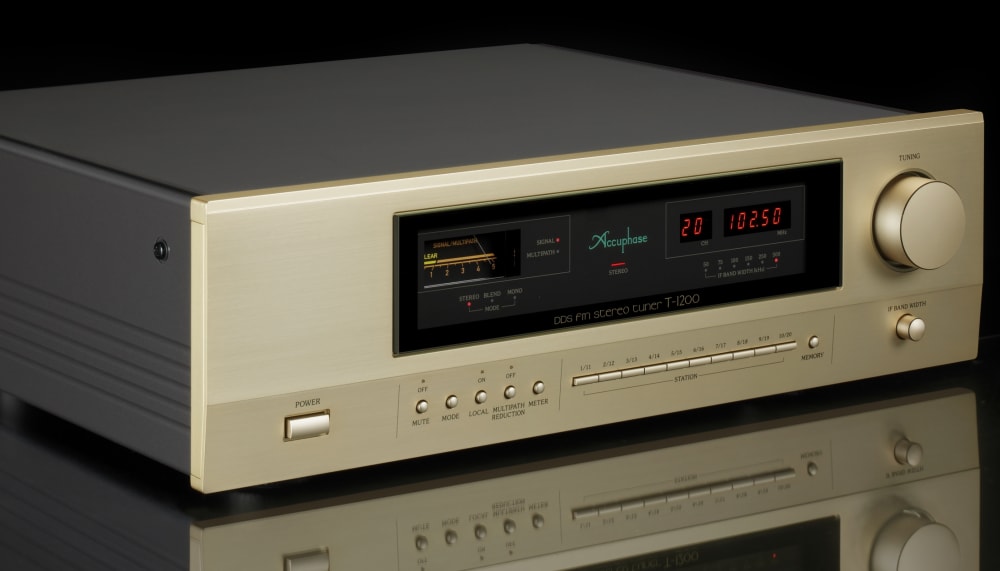 Accuphase T-1200 är en DDS FM Stereo Tuner som använder en blandning av den senaste RF-kretskonstruktionen med sofistikerad digital signalbehandling. De flesta stora funktioner efter mellanfrekvenssteget, såsom det variabla IF-bandbreddsfilteret, multipath-reduktion, digital FM-demodulator och DS-DC-stereodemodulering, har flyttats till programvara på DSP-chippet. Manuell inställning med pulse tuning metoden, plus 20-stationsminnesinställning. En digital utgång ger ytterligare flexibilitet. Denna FM-tuner har utvecklats för krävande ljud- och musikentusiaster och uppnår en felfri ljudkvalitet och enastående prestanda i ett lättanvänt format.
